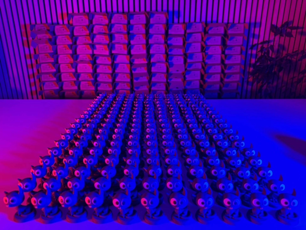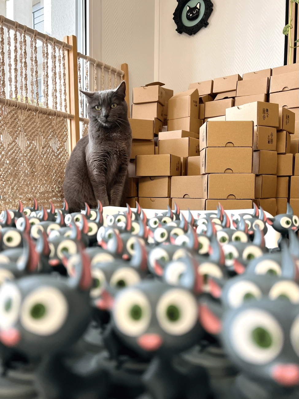 Résultat : 200 chats ont été produits. Nous avons récupéré toutes ces petites boules de résine, et tous les membres de l’agence se sont attelés à la mise en forme finale :